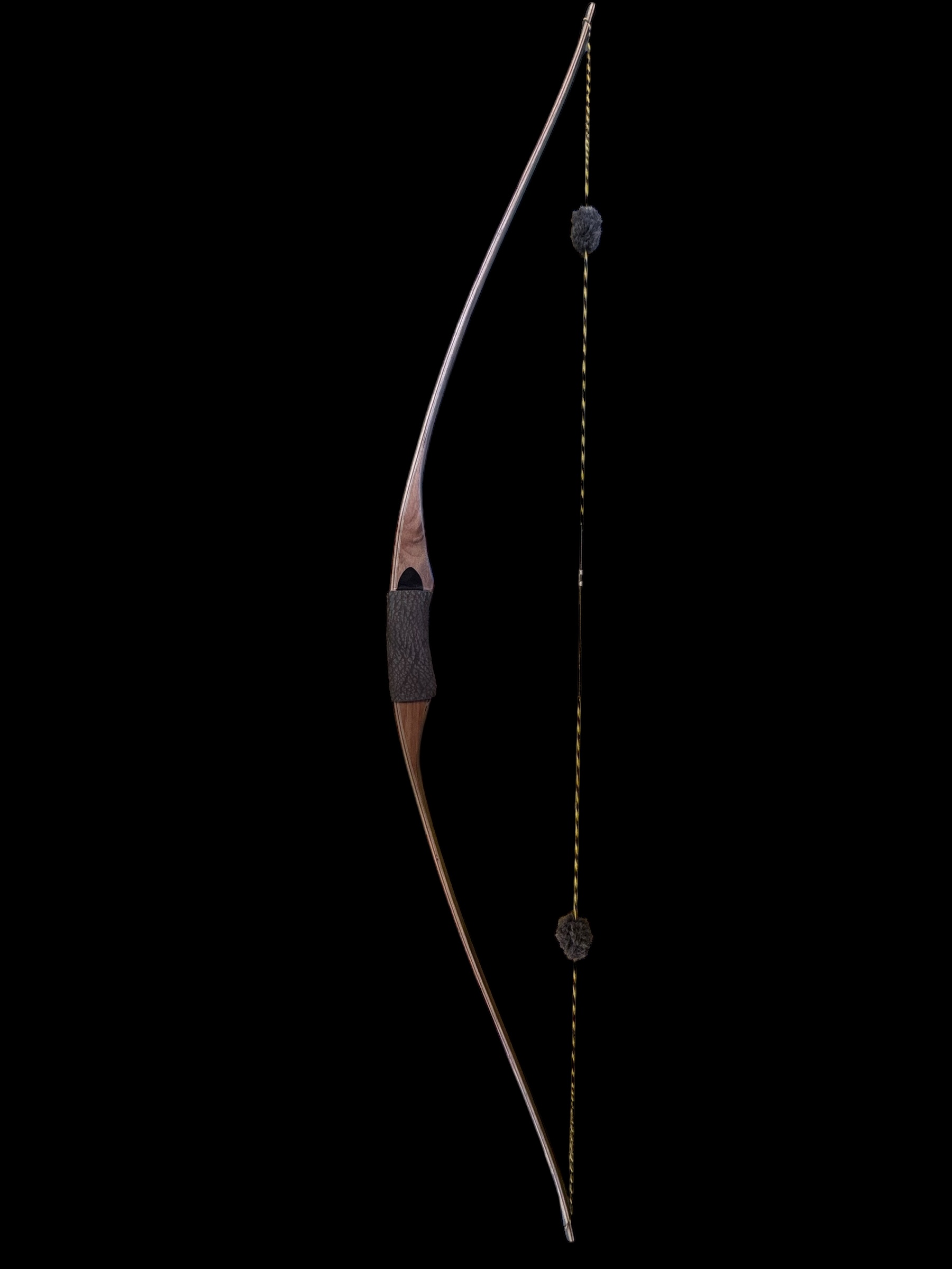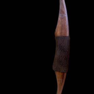 60″ Arcadia Longbow, RH, 53#@28″, Pao Farro riser, Macassar Ebony Veneers, G-10 tips, Leather grip wrap.