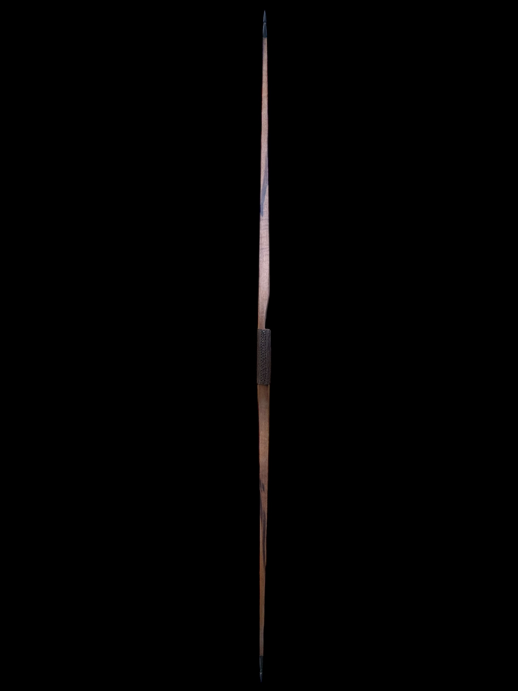 62″ Manitou Takedown Longbow, RH, 45#@28″, Zircote riser, Tiger Myrtle Veneers, G-10 reinforced Sheephorn tips, Ace Latch takedown system, Leather grip wrap.