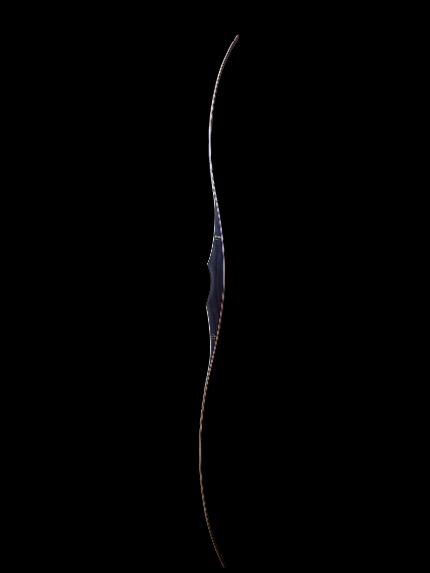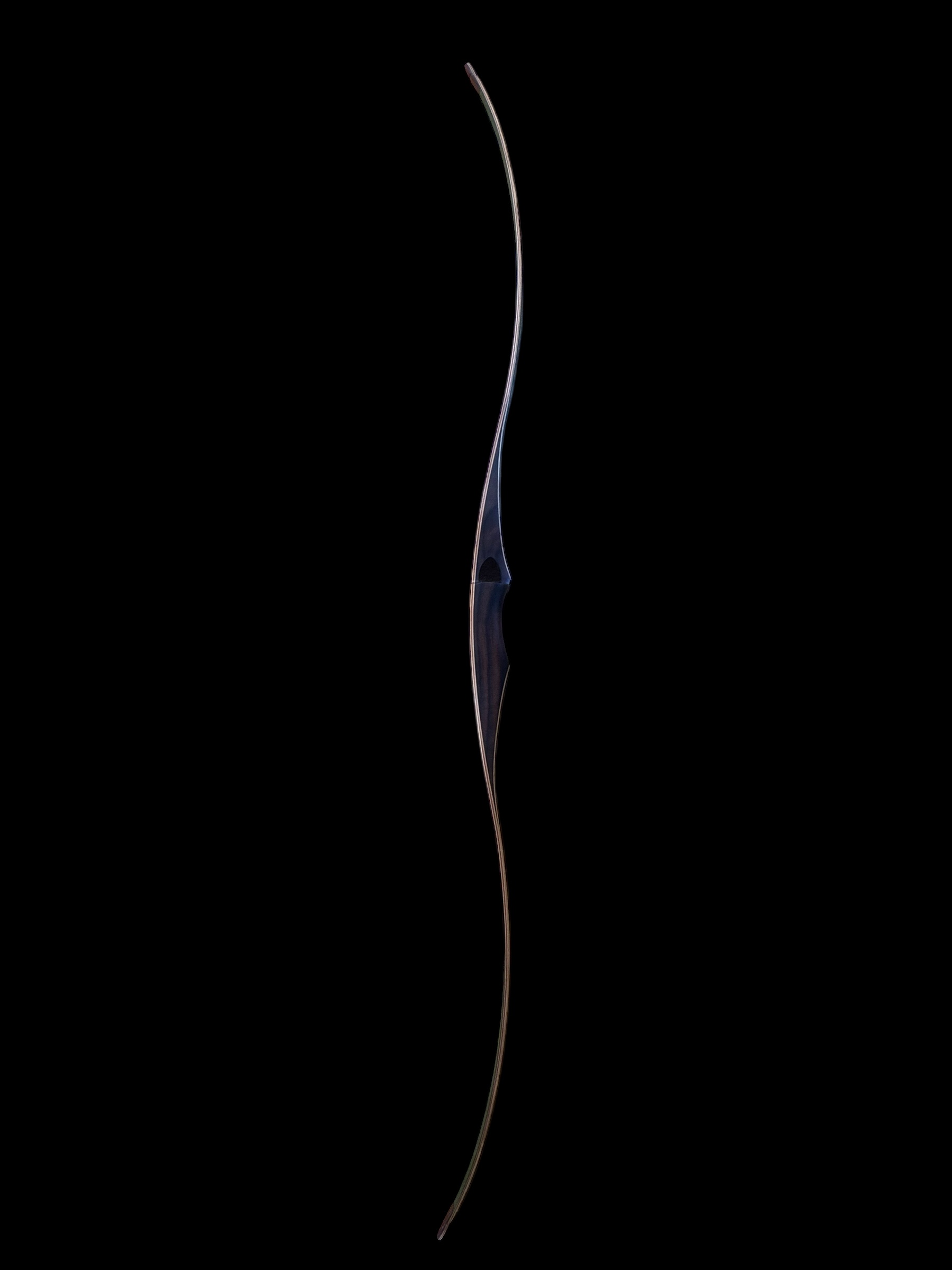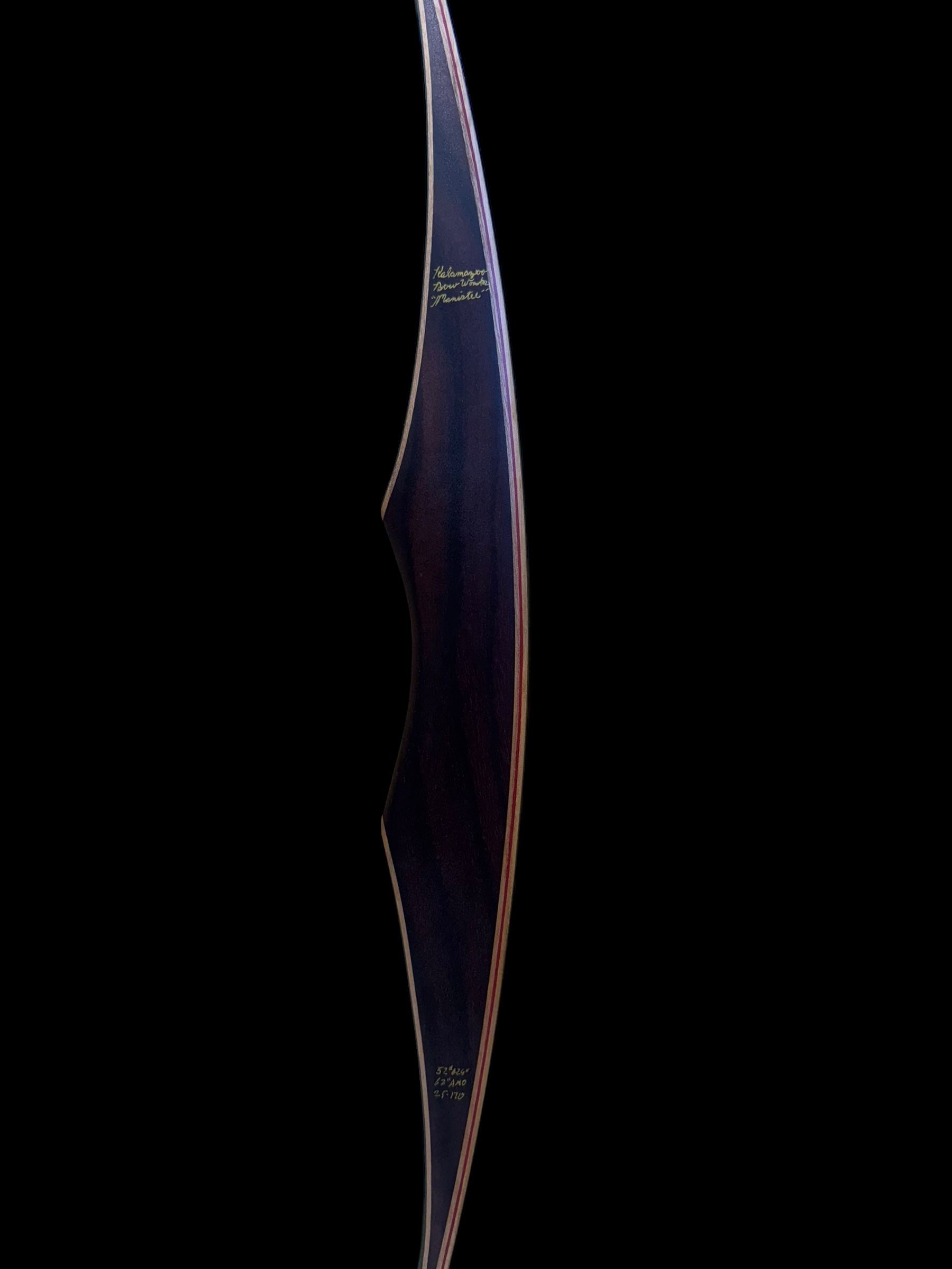 62″ Manistee Longbow, RH, 44#@28″, Patagonian Rosewood riser, Black Multicam fabric veneer back, Black Glass belly, G-10 tips.