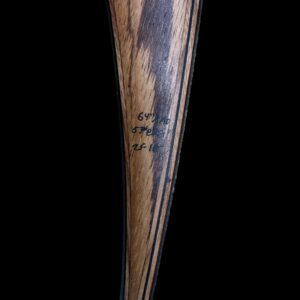 60″ Arcadia Longbow, RH, 53#@28″, Pao Farro riser, Macassar Ebony Veneers, G-10 tips, Leather grip wrap.